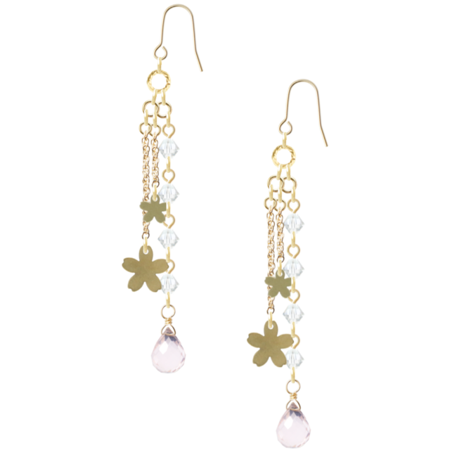 ゴールドの小花モチーフとクリアクリスタル、優しいピンクのしずくが連なる、揺れるデザインのピアスです。